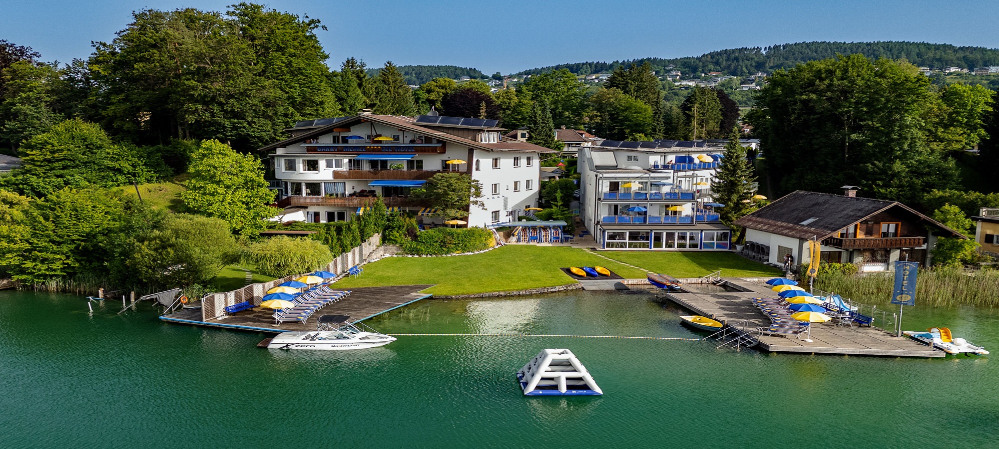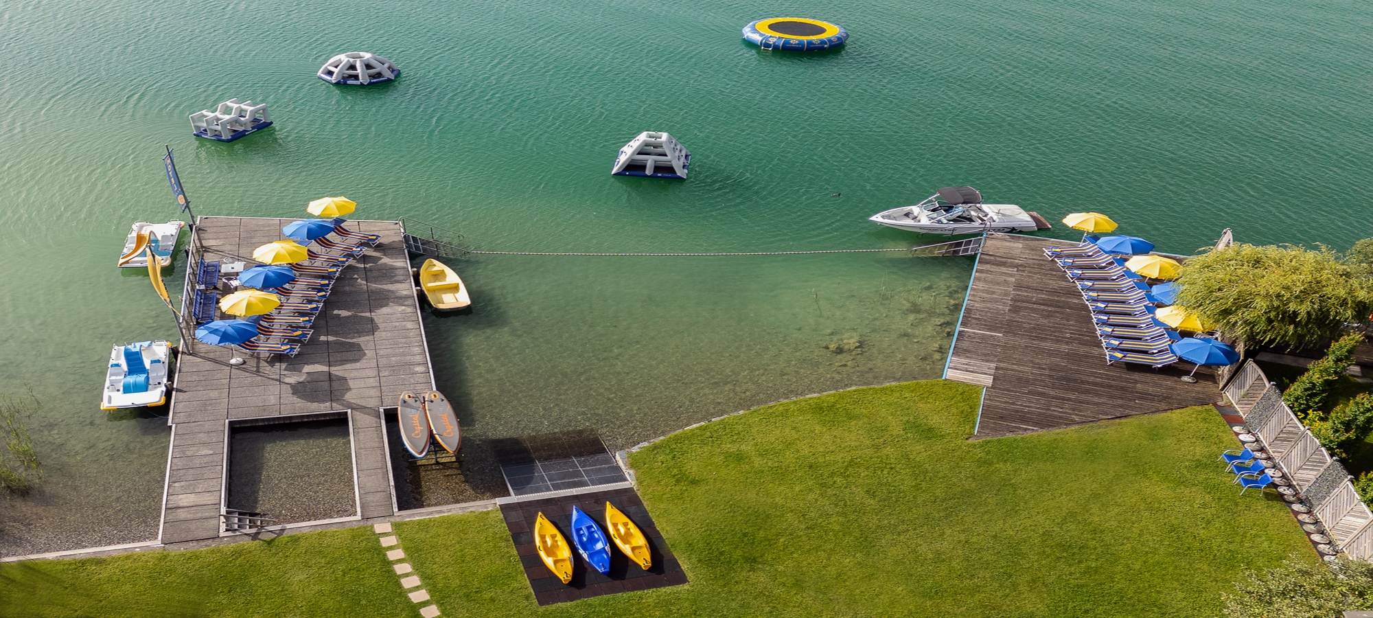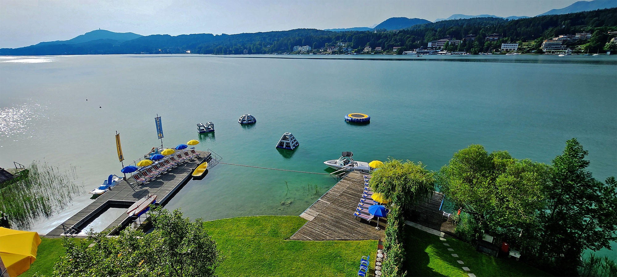 Unser inkludierter Bootspark bietet Ihnen Abwechslung zur Erkundung des Wörthersees. Oder Sie vergnügen sich in unserem Aquapark mit Wassertrampolin, Kletterbergen und der Wasserpyramide.