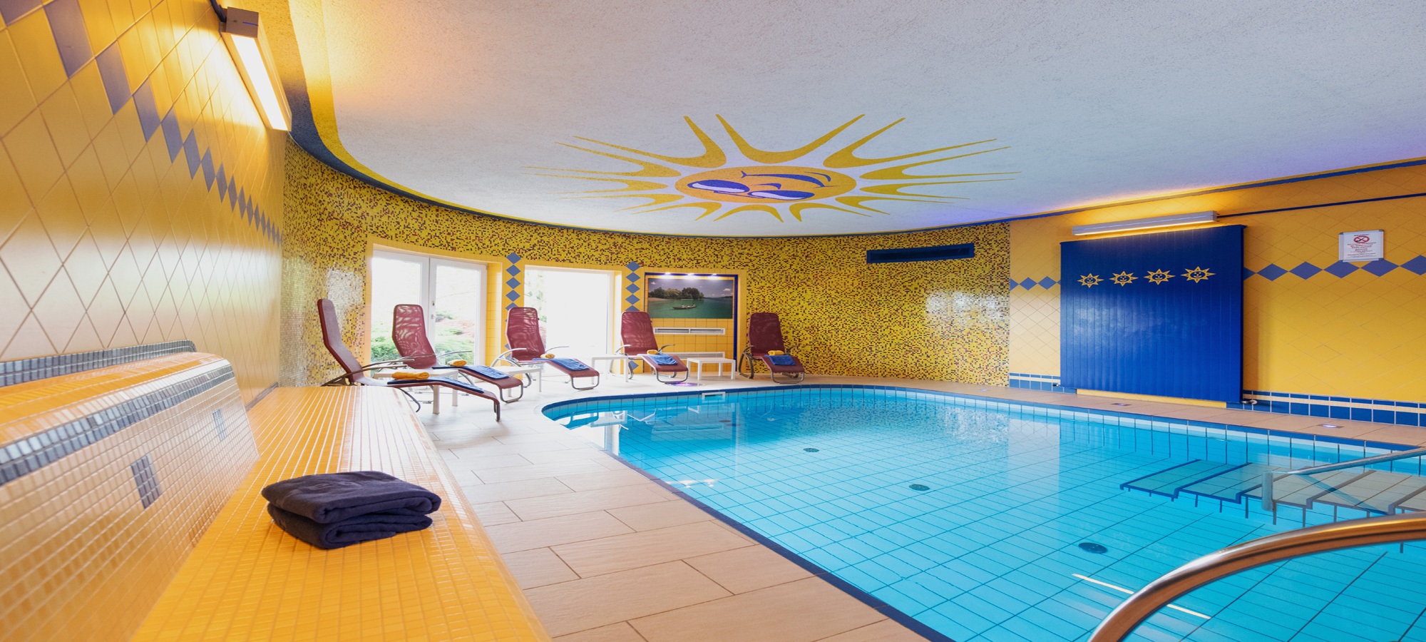Unser Hallenbad mit Farblichtspiel und zahlreichen Wellness-Vergnügen lädt ein zum Relaxen und Genießen, wenn draußen einmal nicht die Sonne scheint.